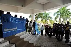 Action associative rappelant que « l'eau et le pétrole ne se mélangent pas »... devant l'une des entrées de la Conférence sur le climat de Cancun