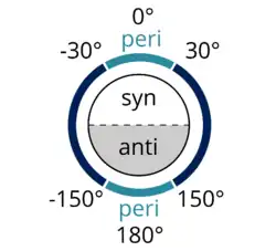 Synpériplanaire est semblable à antipériplanaire. Dans le conformère synpériplanaire, A et D sont du même côté du plan de la liaison, l'angle dièdre entre A–B et C–D étant compris entre +30° et −30° (voir figure 2).