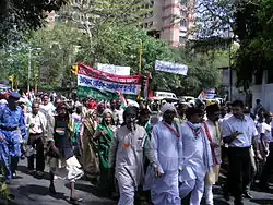 À partir des années 1920, pendant la lutte pour le Swaraj (indépendance), le Congrès adhère aux principes de Gandhi de non-violence et d'harmonie entre les classes sociales[6]. Après l'Indépendance, le Congrès affirme son soutien à la démocratie parlementaire et devient le parti dominant de la vie politique indienne, continuant d'abriter en son sein des courants parfois divergents, notamment des socialistes comme Jawaharlal Nehru et des conservateurs tel que Vallabhbhai Patel[6],[7]. Au niveau national, le parti proclame sous la direction de Nehru vouloir suivre un « schéma socialiste de la société »[8] : le Congrès favorise une économie mixte avec un secteur public important et des mesures devant mettre fin à la misère et au chômage[6]. Mais malgré cette orientation nationale marquée à gauche, la structure souple du parti permet alors aux courants conservateurs de continuer à évoluer au sein du Congrès, notamment au niveau local[7].