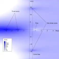 De plus, il n'y a aucun zéro sur l'axe Re(s) = 1 (ce résultat est équivalent au théorème des nombres premiers[7], voir section historique ci-dessous). Du coup, l'hypothèse de Riemann peut se reformuler ainsi : si 0 < Re(s) < 1 et si s est un zéro de ζ (ou, ce qui revient au même, de η), alors sa partie réelle vaut 1/2.