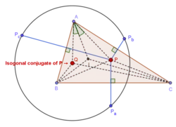 Le conjugué isogonal d'un point P n'appartenant pas au cercle circonscrit du triangle (ABC) est aussi le centre du cercle circonscrit du triangle (PaPbPc) construit en prenant les symétriques de P par rapport aux côtés du triangle (ABC)[2].