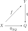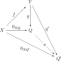 commute. De plus, le morphisme q doit être universel pour ce diagramme, c'est-à-dire que n'importe quel autre morphisme q′: YQ′ peut être obtenu en composant q avec un unique morphisme u : QQ :