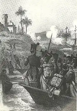 L'équipage d'une chaloupe de la frégate française Duchesse de Berry est massacré et décapité par un millier d'Algériens près de Dellys à l'est d'Alger, les têtes mutilées sont vendues au dey d'Alger 100 piastres la pièce[48]. Enfin, le bombardement de La Provence (1829), un navire battant pavillon parlementaire, par les batteries d'Alger représente le casus belli qui déclenche la « guerre d'Alger » ( à ).