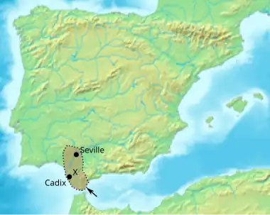 Tariq ayant établi une tête de pont dans le sud, Moussa Ibn Noçaïr (Musa ben Nusayr), gouverneur d'Ifriqiya, débarque en Espagne la même année, avec une nouvelle armée de 10 000 à 18 000 hommes, d'origine arabe et syrienne[9],[10],[11], dans la ville de Cadix, et la place sous contrôle musulman. Les forces musulmanes, bien armées, conquièrent ensuite facilement, presque sans résistance, Medina-Sidonia. Puis elles vont assiéger Séville, mais celle-ci ne tombe qu'après un siège d'un mois.