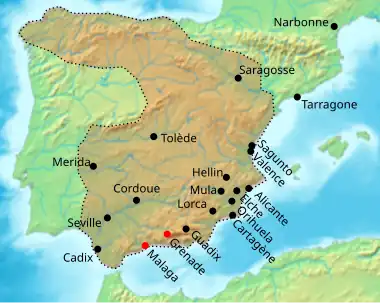 Avant les premières conquêtes musulmanes en 711, le territoire de la péninsule Ibérique constituait la partie sud du royaume wisigoth, à l'exception des régions rebelles astures, cantabres et basques du nord, et des côtes restées romaines (exarchat de Carthage) du sud. Les rois wisigoths régnaient depuis les Invasions barbares du Ve siècle sur la péninsule Ibérique et la Septimanie dans le sud de la Gaule. Les Baléares sont alors encore romaines, et n'ont pas été concernées par la conquête musulmane. Elles passeront sous la dépendance au moins nominale du royaume franc en 798, la flotte romaine d'Orient, trop éloignée de ses bases, ne parvenant plus à les défendre des attaques musulmanes. Malgré la protection franque, ces attaques continuent, conduisant à une certaine soumission politique, puis à la conquête de l'archipel par l'émirat de Cordoue, entre 902 (Ibiza et Majorque) et 903 (Minorque).