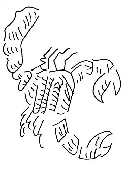 Notons que dans l’astronomie mésopotamienne, la figure du Scorpion se présente sous deux formes différentes : nous avons un Petit Scorpion, celui a donné la constellation que nous connaissons aujourd’hui par le truchement des Grecs, et un Superscorpion, qui, dans le zodiaque, couvre l’espace des 7e et 8e signes, soit Libra et Scorpius. Nous avons en effet dans la série MUL.APIN : mul.ZI.BA.AN.NA SI mul.GÍR.TAB, soit « La Balance = la Corne du Scorpion »[6]. Voir l’image du Superscorpion embrassant un personnage tenant une balance, sur le zodiaque de Tadmor / Palmyre, daté de 34 de notre ère, dans le page consacrée à la constellation de la Balance.