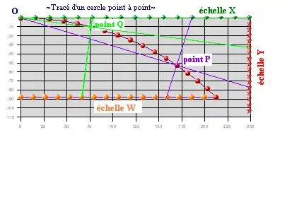 La méthode consiste à créer trois « échelles » X, Y, W graduées en n subdivisions égales, 16 par exemple, à relier les points correspondants des échelles X et W, à relier l'origine au point correspondant de l'échelle Y, le point d'intersection de ces deux droites est un point P du cercle. Si les 16 points ne suffisent pas on peut encore subdiviser les trois échelles en 32 parties, ou 64. Les échelles sont positionnées selon des calculs trigonométriques élémentaires. Le maximum (B) de l'échelle X est 2R tan(α/2), 248,53 m dans notre exemple, le maximum de l'échelle Y est 2R tan2(α/2), le maximum de l'échelle W est R sin(α) et le positionnement de cette échelle est à l'ordonnée R(1 – cos(α)).
