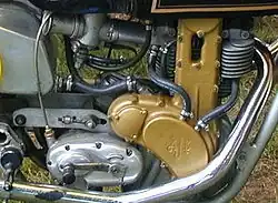 « The middleweight design featured twin cams and a semi-unit construction, with the gearbox bolted directly to the crankcase. »