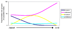 Du fait de l’évolution du matériel organique disponible, la représentation de ces différents groupes varient de l’amont vers l’aval du cours d’eau. En amont, c’est-à-dire dans la partie torrentielle, où le matériel organique grossier est abondant, on trouve une forte proportion de broyeurs mais aussi de collecteurs et les brouteurs sont peu représentés. La proportion de brouteurs augmente ensuite, ainsi que celle des collecteurs, au détriment des broyeurs dont les populations régressent significativement, pour finalement disparaître complètement. En aval, où subsiste presque uniquement le matériel organique particulaire, les collecteurs constituent le groupe dominant. Quant aux prédateurs, leur proportion reste toujours à peu près constante ; seule varie la représentation des espèces au sein du groupe, qui suit l’évolution des proies disponibles. Des variations atypiques dans la répartition des différents groupes invertébrés le long d’un cours d’eau sont le signe d’une perturbation du milieu naturel.