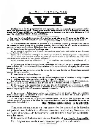 - ↑ Ordonnance du 5 mars 1942 concernant la détention d’armes, Verordnungsblatt des Militärbefehlshabers in Frankreich (VOBIF), no 56, 18 mars 1942, p. 351-352