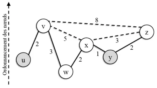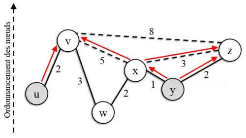 - ↑ La valeur totale de ce chemin est 4 + 1 = 5, supérieure à celle du chemin B-D-E, qui est le plus court chemin de B à E. La contraction portant sur le nœud C, le chemin B-C-E n'est pas retenu par le calcul de l'algorithme de contraction.