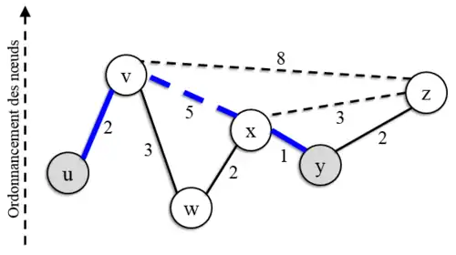 | Etape 2 : x est choisi comme second nœud à traiter pour la recherche partant de y ![]() | Etape 3 : Plus court chemin trouvé![]() |