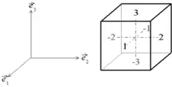 Un solide est décrit dans un repère orthonormé direct. Considérons un cube de matière de côté a dont les faces sont normales aux axes du repère. Numérotons ses faces :