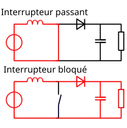 - une phase d'accumulation d'énergie : lorsque l'interrupteur S (voir figure 1) est fermé (état passant), cela entraîne l'augmentation du courant dans l'inductance donc le stockage d'une quantité d'énergie sous forme d'énergie magnétique. La diode D est alors bloquée et la charge est alors déconnectée de l'alimentation ;