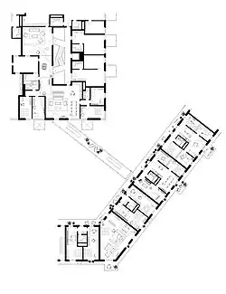 Plan d'un cluster : un espace partagé (salon, salle à manger, cuisine) entouré d'espaces privés. Architecte: Adrian Streich