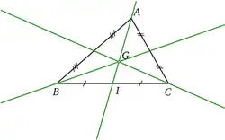 En notant I le milieu de [BC], G a pour coordonnées barycentriques (1,2) par rapport au repère (A,I) de la droite (AI).