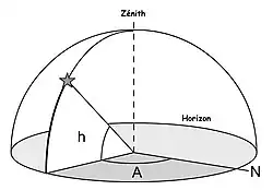 - La hauteur (h sur la figure), est l'angle vertical entre le plan horizontal et l'objet visé. Il varie entre 0° (horizon) et 90° (zénith)[1]. Il est cependant possible d'obtenir des valeurs négatives lors d'une observation à partir d'un lieu élevé. Le point situé aux pieds de l'observateur (-90°) est appelé le nadir[2].