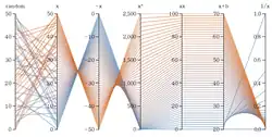 Ajouter plus de dimensions dans un graphe de coordonnées parallèles (souvent abrégé en coords-|| ou PC) nécessite simplement de rajouter plus d'axes. L'intérêt des coordonnées parallèles se trouve dans le fait que certaines propriétés géométriques de plusieurs dimensions se transforment facilement en 2D. Par exemple, une série de points sur une ligne dans n-plans se transforme en une série de lignes dans les coordonnées parallèles se faisant intersection à n-1 points. Lorsque n = 2, cela montre une dualité point ↔ ligne éclairant pourquoi les fondations mathématiques des coordonnées parallèles sont développées sur une projection plutôt que dans l'espace euclidien.