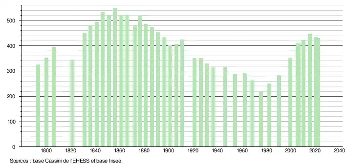 L'évolution du nombre d'habitants est connue à travers les recensements de la population effectués dans la commune depuis 1793. Pour les communes de moins de 10 000 habitants, une enquête de recensement portant sur toute la population est réalisée tous les cinq ans, les populations de référence des années intermédiaires étant quant à elles estimées par interpolation ou extrapolation[12]. Pour la commune, le premier recensement exhaustif entrant dans le cadre du nouveau dispositif a été réalisé en 2005[13].