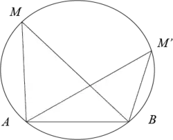Étant donné une corde d'un cercle de centre , tous les angles pour des points du cercle situés du même côté de la corde ont même mesure, égale à .