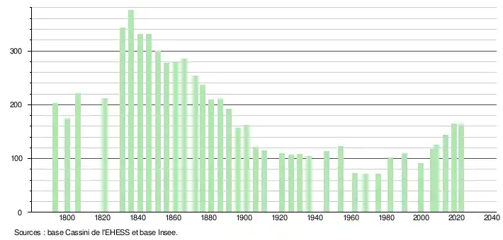 L'évolution du nombre d'habitants est connue à travers les recensements de la population effectués dans la commune depuis 1793. Pour les communes de moins de 10 000 habitants, une enquête de recensement portant sur toute la population est réalisée tous les cinq ans, les populations de référence des années intermédiaires étant quant à elles estimées par interpolation ou extrapolation[31]. Pour la commune, le premier recensement exhaustif entrant dans le cadre du nouveau dispositif a été réalisé en 2008[32].