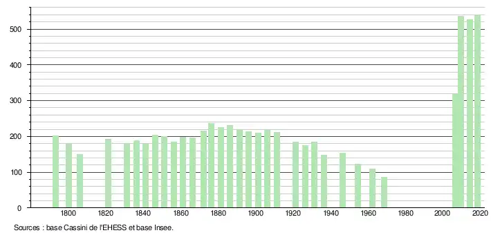 L'évolution du nombre d'habitants est connue à travers les recensements de la population effectués dans la commune depuis 1793. Pour les communes de moins de 10 000 habitants, une enquête de recensement portant sur toute la population est réalisée tous les cinq ans, les populations de référence des années intermédiaires étant quant à elles estimées par interpolation ou extrapolation[6]. Pour la commune, le premier recensement exhaustif entrant dans le cadre du nouveau dispositif a été réalisé en 2004[7].