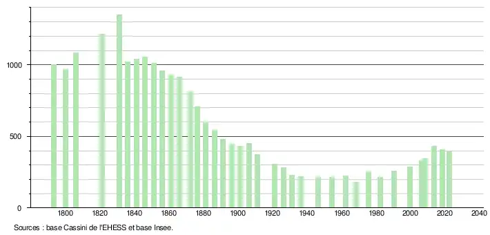 L'évolution du nombre d'habitants est connue à travers les recensements de la population effectués dans la commune depuis 1793. Pour les communes de moins de 10 000 habitants, une enquête de recensement portant sur toute la population est réalisée tous les cinq ans, les populations de référence des années intermédiaires étant quant à elles estimées par interpolation ou extrapolation[31]. Pour la commune, le premier recensement exhaustif entrant dans le cadre du nouveau dispositif a été réalisé en 2008[32].