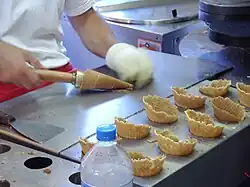 On peut l'utiliser fourré de glace, comme décoration d'un gâteau glacé : Charles Elmé Francatelli le cite en 1846[2] ; Garlin donne, en 1889, une recette de gaufre roulée, servie froide, et dans laquelle on introduit de la crème à la Chantilly avec un cornet de papier ou une poche à douilles[3] ; ce cornet à la Chantilly est repris par Pierre Lacam, (« fait d'une pâte aux amandes et à la vanille cuite au four vif, roulée en cornet, refroidie dans des douilles, puis garnie de chantilly[4] », mais, surtout, Lacam et Charabot donnent en 1893 la recette des cornets à la noisette glacés : une pâte faite de noisettes grillées, d'amandes, de blanc d'œufs, de sucre et de farine, cuite à four vif, est roulée en cornets qui sont garnis, « avec une glace à la crème ou aux fruits[5] ».
