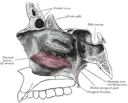 La face médiale est convexe et fait face à la cloison des fosses nasales. Elle est marquée par de nombreux sillons correspondant aux vaisseaux sanguins.