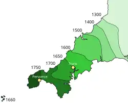 Néanmoins, la langue cornique continue à se développer au début de la période du moyen cornique (1200-1600) pour atteindre un pic d'environ 39 000 locuteurs au XIIIe siècle, après quoi le nombre commence à diminuer. Au fil du temps, la population s'anglicise, surtout à partir du XVIe siècle et de l'imposition de la liturgie en anglais en 1549. Selon la tradition, le décès, en 1777, de Dolly Pentreath, marchande de poissons et dernière locutrice monolingue connue, aurait fait du cornique une langue morte. Ses dernières paroles auraient été : « Me ne vidn cewsel Sawznek ! » (« Je ne parlerai pas l'anglais ! »). Mais on suppose qu'elle parlait un peu d'anglais et qu'elle n'était donc pas la dernière locutrice monolingue ; il s'agirait plutôt d'un certain Chesten Marchant, réputé dernier locuteur monolingue, qui mourut en 1676. L'existence de locuteurs du cornique est encore attestée au cours du XIXe siècle, et les pêcheurs de la région continuaient de compter en cornique jusqu'aux années 1940. On a retrouvé un certain usage traditionnel du cornique parmi les mineurs des mines de charbon. Mais toujours est-il que Dolly Pentreath comptait avant le XXe siècle au nombre des dernières personnes capables de parler la langue couramment.