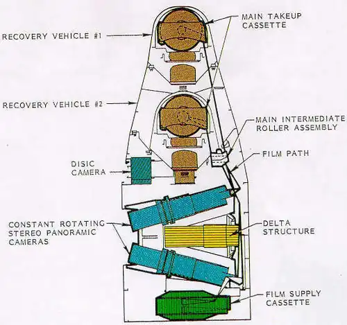 Les premiers systèmes transportent un système photographique d'un format panoramique simple (KH-1, KH-2, KH-3 et KH-6) alors que les systèmes tardifs (KH-4, KH-4A et KH-4B) transportent deux systèmes photographiques panoramiques séparés d'un angle de 30 degrés. Ces deux systèmes sont référencés comme « for » pour celui qui est dirigé dans le sens de déplacement du satellite et « aft » pour celui qui est dirigé dans le sens contraire. Toutes les images sont en panchromatique, c'est-à-dire noir et blanc, excepté quelques films test en couleur sur certaines missions KH-4B.