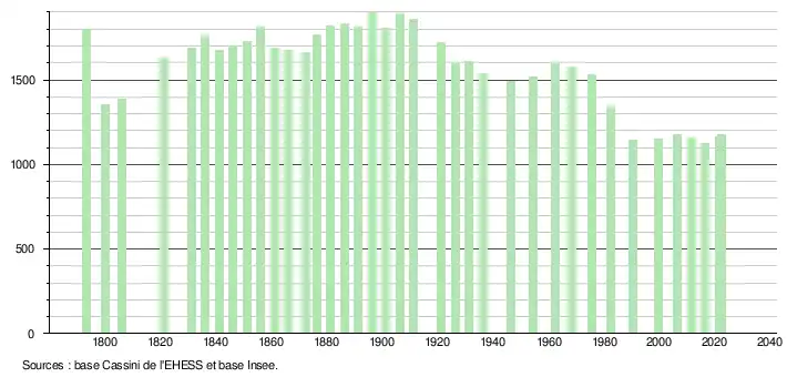 L'évolution du nombre d'habitants est connue à travers les recensements de la population effectués dans la commune depuis 1793. Pour les communes de moins de 10 000 habitants, une enquête de recensement portant sur toute la population est réalisée tous les cinq ans, les populations de référence des années intermédiaires étant quant à elles estimées par interpolation ou extrapolation[21]. Pour la commune, le premier recensement exhaustif entrant dans le cadre du nouveau dispositif a été réalisé en 2006[22].