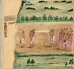 La ville indienne de Banāras est connue sous le nom de Great Cremation Ground (Grand terrain de crémation) car elle contient Manikarnikā, l'endroit où les Hindous amènent les défunts pour la crémation. Manikarnikā est situé au centre de la ville, le long du Gange[5]. La procession funéraire se déroule normalement de la maison du défunt jusqu'au lieu de crémation et est normalement une affaire exclusivement masculine[6]. Le fils aîné mène la procession, suivi des autres[7]. Contrairement aux traditions occidentales, la procession part dès que possible après le décès et les personnes en deuil chantent le nom de Dieu en route vers le crématorium[8],[9]. Le corps lui-même est baigné et enveloppé dans un drap blanc, puis transporté jusqu'au lieu de crémation sur une litière en bambou[4]. Le fils en tête de la procession porte un pot à feu lorsqu'il quitte la maison, qui sert à allumer le bûcher funéraire[4],[7]. La procession se termine à Manikarnikā, où le corps est plongé dans le Gange, puis aspergé d'huile de santal et recouvert de guirlandes de fleurs avant d'être incinéré[5].