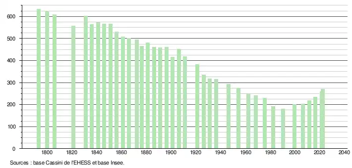 L'évolution du nombre d'habitants est connue à travers les recensements de la population effectués dans la commune depuis 1793. Pour les communes de moins de 10 000 habitants, une enquête de recensement portant sur toute la population est réalisée tous les cinq ans, les populations de référence des années intermédiaires étant quant à elles estimées par interpolation ou extrapolation[16]. Pour la commune, le premier recensement exhaustif entrant dans le cadre du nouveau dispositif a été réalisé en 2006[17].