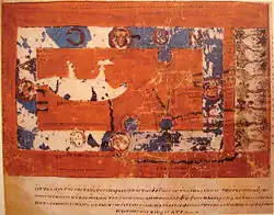 Enluminure de la Topographie chrétienne (IXe siècle) montrant la Terre plate enchâssée dans un tabernacle.