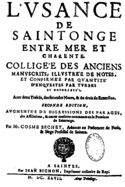 - 1re édition : L'usance de Saintonge, colligée des anciens manuscrits ... Avec deux traictez, l'un des secondes nopces, & l'autre du droict de reversion, Saintes, Jean Bichon, 1633.