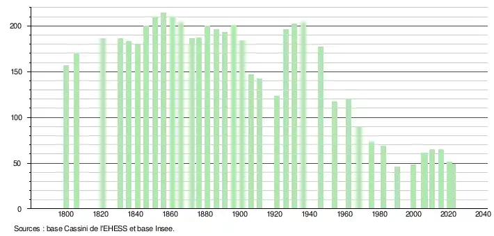 L'évolution du nombre d'habitants est connue à travers les recensements de la population effectués dans la commune depuis 1800. Pour les communes de moins de 10 000 habitants, une enquête de recensement portant sur toute la population est réalisée tous les cinq ans, les populations de référence des années intermédiaires étant quant à elles estimées par interpolation ou extrapolation[14]. Pour la commune, le premier recensement exhaustif entrant dans le cadre du nouveau dispositif a été réalisé en 2005[15].