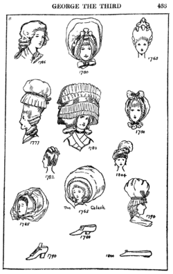 Jusqu'en 1720, la mode est à la coiffe dite à la fontange consistant en un bonnet garni d'une forme en fil de fer assez élevée composée de plusieurs degrés garnis de mousseline, de rubans, de fleurs et de plumes.