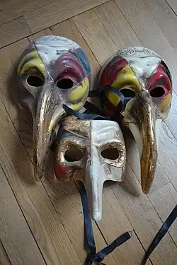 Le costume est également associé à un personnage de la commedia dell'arte appelé Il Medico della Peste. Ce personnage porte un masque vénitien typique dont la forme macabre ressemblant à un vautour est due à Charles de Lorme, premier médecin de Louis XIII. Le masque vénitien était normalement blanc, composé d'un bec creux, de deux trous destinés à être recouverts de bésicles de protection.