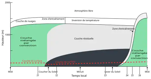 - Pendant la journée, le sol se réchauffe et l'augmentation de température se transmet depuis la couche de surface vers l'inversion de température (couche stable) au sommet de la couche limite atmosphérique. Le processus de transfert est convectif ce qui produit des turbulences vigoureuses donnant une couche bien mélangée au-dessus de la couche de surface et en même temps fait croître l'épaisseur de la CLA (image ci-contre)[4]. L'effet de la turbulence diurne est d'égaliser la température potentielle et d'obtenir un rapport de mélange constants dans la couche mélangée. Le mélange est souvent le plus intense de 1 à 2 heures après le midi solaire[8].