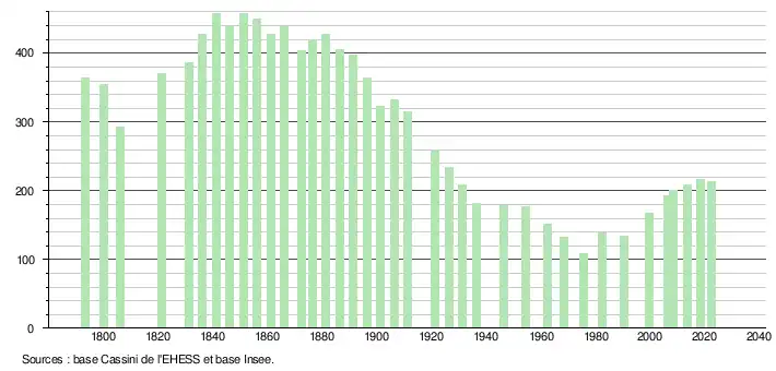 L'évolution du nombre d'habitants est connue à travers les recensements de la population effectués dans la commune depuis 1793. Pour les communes de moins de 10 000 habitants, une enquête de recensement portant sur toute la population est réalisée tous les cinq ans, les populations de référence des années intermédiaires étant quant à elles estimées par interpolation ou extrapolation[20]. Pour la commune, le premier recensement exhaustif entrant dans le cadre du nouveau dispositif a été réalisé en 2008[21].