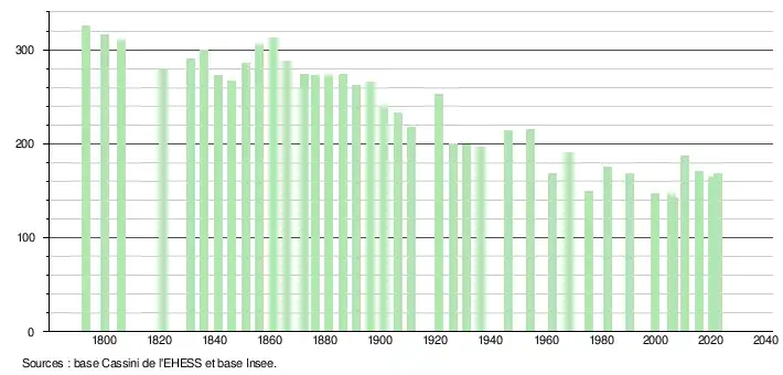 L'évolution du nombre d'habitants est connue à travers les recensements de la population effectués dans la commune depuis 1793. Pour les communes de moins de 10 000 habitants, une enquête de recensement portant sur toute la population est réalisée tous les cinq ans, les populations de référence des années intermédiaires étant quant à elles estimées par interpolation ou extrapolation[46]. Pour la commune, le premier recensement exhaustif entrant dans le cadre du nouveau dispositif a été réalisé en 2005[47].