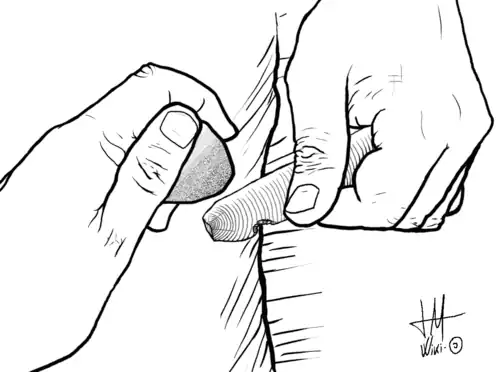 Le tailleur prend une lame ou un éclat et le place sur un support au bord aigu. Il crée une coche au moyen de coups légers ou en pressant le bord de la pièce le long du bord aigu du support. Il agrandit la coche jusqu'à ce que la lame se brise.