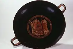 À l'intérieur le médaillon central illustre une scène de séduction pédérastique, rite de passage dans la Grèce antique au cours duquel un adulte transmet à un éphèbe plus jeune les valeurs citoyennes et aristocratiques. Deux personnages se font face : l'éraste dont l'himation est ouvert en signe de séduction et l'éromène, plus petit et enveloppé dans son vêtement[4].