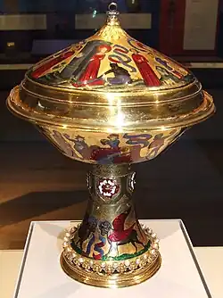 L'intérieur du couvercle contient un médaillon d'émail circulaire aux bordures dorées ouvragées. Il représente le Christ à hauteur de poitrine, faisant un signe de bénédiction et tenant un calice contenant une hostie. Il est entouré d'une auréole solaire de couleur rouge. En dessous des deux cylindres ajoutés à la jambe de la coupe, le pied est entouré par les représentations des quatre symboles des Évangélistes, se faisant face deux à deux, sur une surface verte. Lightbown note qu'il s'agit « d'un autre exemple d'une volonté de représentation réalistique[48] ».