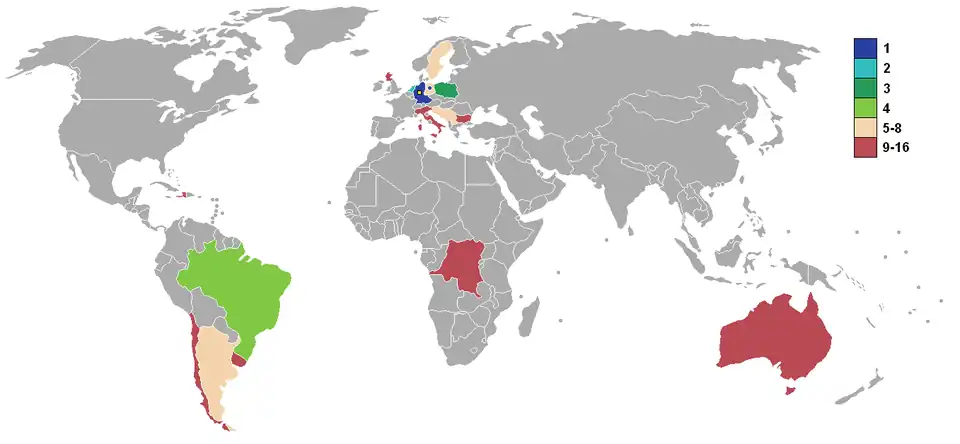 - ↑ Au moment du tirage seulement quinze des seize qualifiés sont connus. Un match d'appui dans le groupe 7 de la zone européenne entre l'Espagne et la Yougoslavie reste encore en effet à jouer le 13 février, ce qui explique la mention des deux nations. La Yougoslavie s'imposera finalement contre l'Espagne et sera qualifiée.