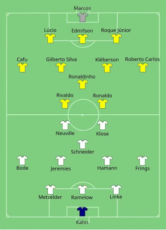 Le Brésil présente une équipe mémorable emmenée par le capitaine Cafu et comptant dans ses rangs les attaquants Ronaldinho, Rivaldo et Ronaldo. Ce dernier marque huit buts au cours de la compétition, et termine sur un doublé en finale face à l'Allemagne à Yokohama (2-0). La formation sud-américaine accroche ainsi une cinquième étoile à son maillot, record qui attend encore d'être battu.