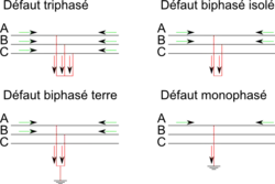 - défaut monophasé : une phase est reliée au neutre ou à la terre (80 % des cas). Sur une ligne à haute tension, ce type de défaut est fréquemment causé par la foudre qui initie un court-circuit entre une phase et la terre.