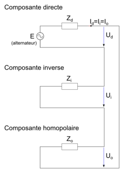 L'impédance directe et inverse de tous les composants électriques à l'exception des machines tournantes étant identiques, il est possible d'écrire On peut réécrire . En remplaçant E on obtient :