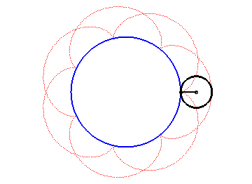- lorsque le cercle roulant est à l'extérieur du cercle directeur, c'est une épicycloïde (dont la cardioïde et la néphroïde sont des cas particuliers) ;